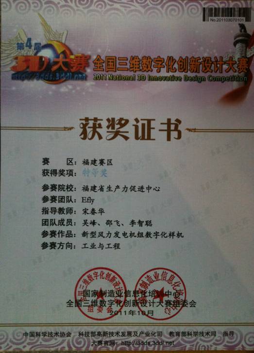 会上对2011年度第四届全国三维数字化创新设计大赛复赛作品近80余件作出评审,我中心Efly团队以“新型风力发电机组数字化样机”参赛作品,获得福建赛区工业与工程组特等奖。至此,省生产力中心已连续三年获得该赛事奖项。
