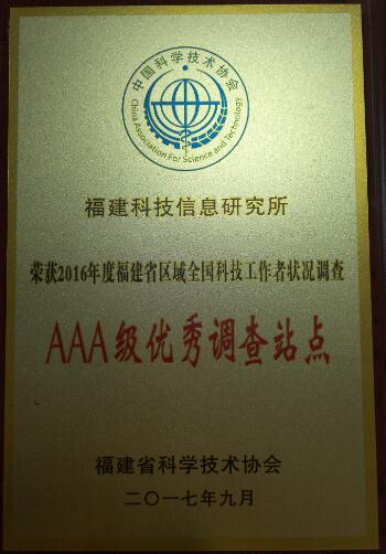 12月20日,省科协组织召开了2017年度福建省全国科技工作者状况调查站点会议,对2016年度福建省优秀调查站点进行通报表彰。我所获2016年度福建省区域全国科技工作者状况调查AAA级优秀调查站点。至此,我所已连续四年获省科技工作者优秀调查站点。此外,我所站点还获得了“优秀信息员”推荐资格与“优秀调查员”推荐资格。